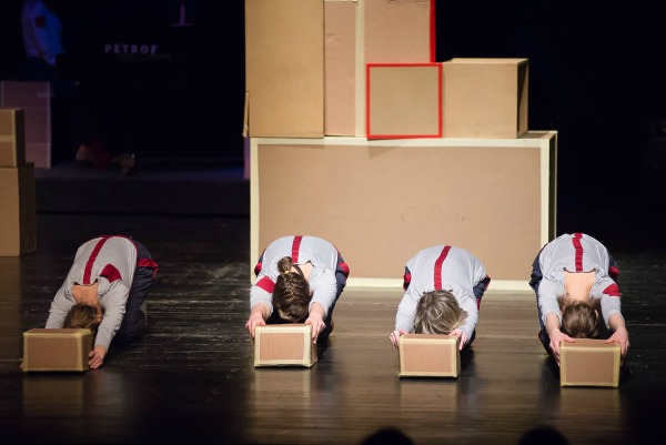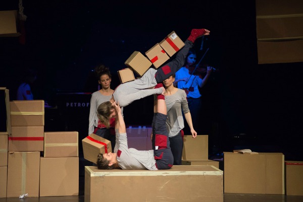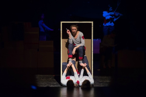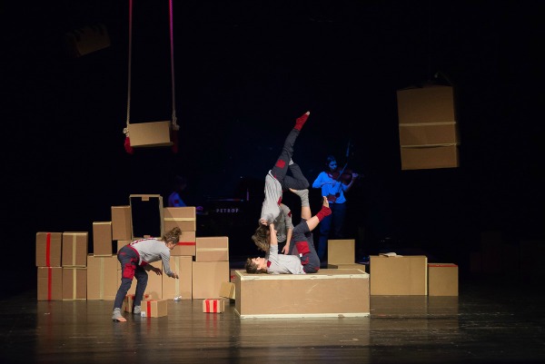 Tokom predstave scenografija oživljava i postaje cirkusko-akrobatsko-plesna rekvizita, uz pomoć koje se osvaja i vazdušni prostor scene. Upravo tako magacionerke olakšavaju svoje radne sate provedene u međuprostoru, ni na nebu ni na zemlji ili u ovom slučaju ni u kutiji ni van nje.
